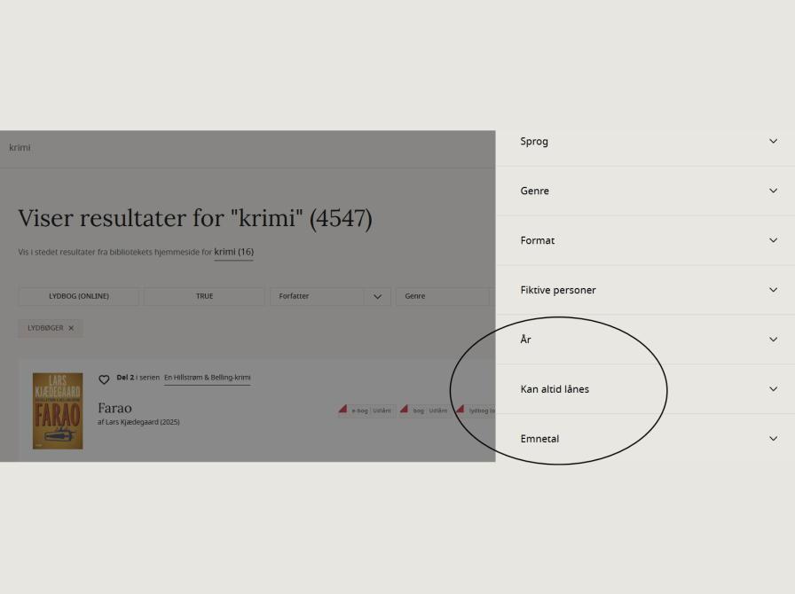 Hvis du foretager en søgning kan du filtrere efter BØGER, DU ALTID KAN LÅNE i søgeresultatet.